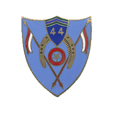 L'écu suisse bleu foncé frappé du chiffre "44" surmonté de deux chevrons verts évoque la patte de col des G.R.D.I.. Les chevrons verts rappellent la couleur des Chasseurs à cheval dont ils se veulent les héritiers.