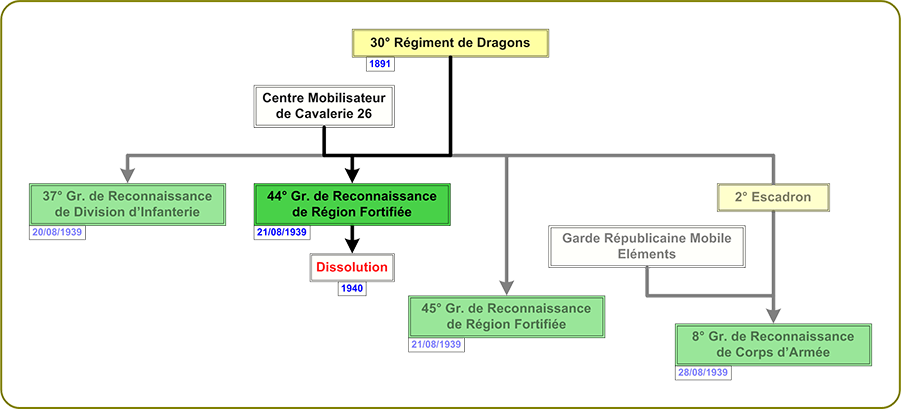 44° Groupe de Reconnaissance de Région Fortifiée Filiation. Décorations et Citations. Aucune Fourragère. Aucune Campagnes et Opérations. Seconde Guerre Mondiale 1939-1945. 1940 Théatre Européen Bataille de France (Verdun - Toul) Insignes. Insigne Amicale 1940 Description Héraldique
