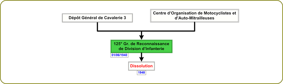 125° Groupe de Reconnaissance de Division d'Infanterie Filiation. Décorations et Citations. Aucune Fourragère. Aucune Campagnes et Opérations. Seconde Guerre Mondiale 1939-1945. 1940 Théatre Européen Bataille de France (Bracieux - Côte 123 - Dhuison - Saint-Aignan - Saint-Cyran - Fléré-la-Rivière) Insignes. Pas d'insigne connu.