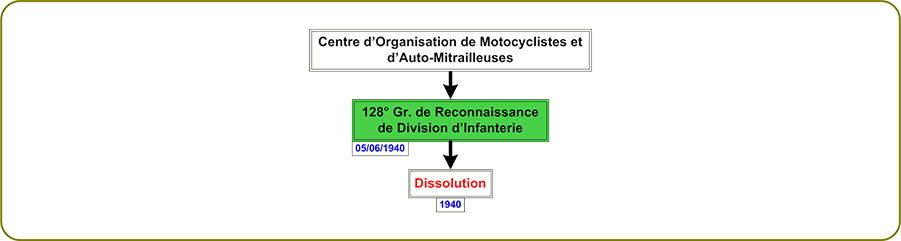 128° Groupe de Reconnaissance de Division d'Infanterie Filiation. Décorations et Citations. Aucune Fourragère. Aucune Campagnes et Opérations. Seconde Guerre Mondiale 1939-1945. 1940 Théatre Européen Bataille de France (Sainte-Gauburge - Moulins-la-Marche - Neully-le-Bisson - Chailloué et Couptrain) Insignes. Pas d'insigne connu.