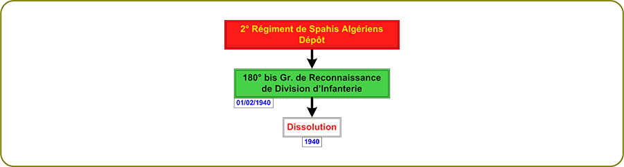 180° bis Groupe de Reconnaissance de Division d'Infanterie Filiation. Décorations et Citations. Aucune Fourragère. Aucune Campagnes et Opérations. Seconde Guerre Mondiale 1939-1945. 1939 - 1940 Théatre d'Afrique du Nord Tunisie Insignes. Pas d'insigne connu.