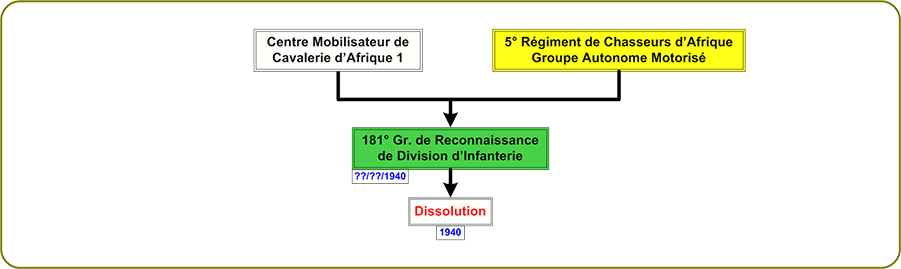 181° Groupe de Reconnaissance de Division d'Infanterie Filiation. Décorations et Citations. Aucune Fourragère. Aucune Campagnes et Opérations. Seconde Guerre Mondiale 1939-1945. 1939 - 1940 Théatre d'Afrique du Nord Algérie Insignes. Pas d'insigne connu.