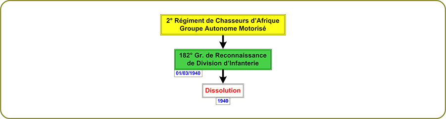 182° Groupe de Reconnaissance de Division d'Infanterie Filiation. Décorations et Citations. Aucune Fourragère. Aucune Campagnes et Opérations. Seconde Guerre Mondiale 1939-1945. 1939 - 1940 Théatre d'Afrique du Nord Algérie Insignes. Pas d'insigne connu.