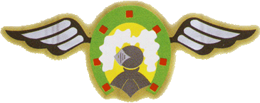 Bouclier romain d'argent frappée d'une fer à cheval ailé noir enserrant le chiffre "1" noir surmonté d'un heaume empanaché noir de face. |
