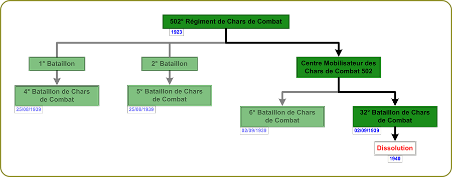 32° Bataillon de Chars de Combat Filiation. Décorations et Citations. Aucune. Fourragère. Aucune. Campagnes et Opérations. Seconde Guerre Mondiale 1939-1945. 1940 Théatre Européens Bataille de France Insignes. Pas d'insigne connu.