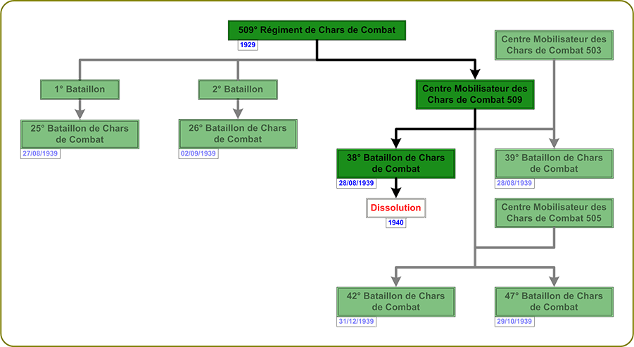 38° Bataillon de Chars de Combat Filiation. Décorations et Citations. Croix de Guerre 1939 - 1945. 1 étoile de vermeil pour citation à l'ordre du Corps d'Armée. Fourragère. Aucune. Campagnes et Opérations. Seconde Guerre Mondiale 1939-1945. 1940 Théatre Européens Bataille de France Insignes. Insigne 1940 Description Héraldique