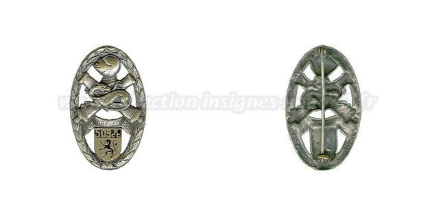 Modèle en métal embouti. Nom du fabriquant inscrit en arc de cercle en bas avec Ahrthus Bertrand à droite et Dépose Paris à gauche. Épingle d'origine mais ressoudée verticalement au lieu d'être oblique.