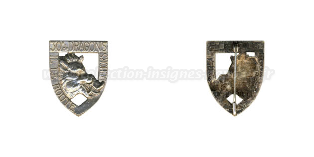 Modèle en métal embouti. Tirage réalisé avec l'inscription "S M" et avec une fixation par épingle verticale.